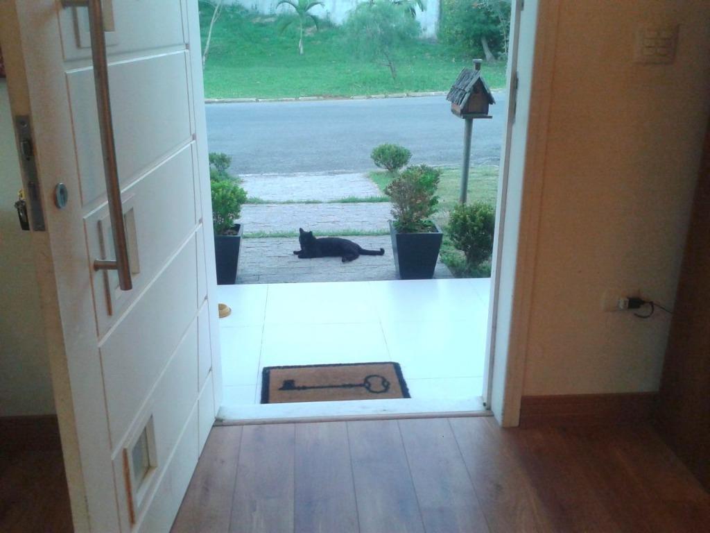 Lindo sobrado em condomínio fechado com 350 m² de área construída e 600m de terreno, possui 4 dormitórios, sendo 2 suítes na parte térrea, com ar condicionado, 1 suíte com closet e hidromassagem, ampla sala com living, com pé direito duplo, deck lateral a sala, mezanino, cozinha com armários, banheiro social com box em vidro, lavabo, área de serviço, 2 vagas de garagem e amplo quintal. Portaria 24 horas. Estuda proposta de permuta, com imovel de menor valor. Entre em contato e agende uma visita com um de nossos corretores.